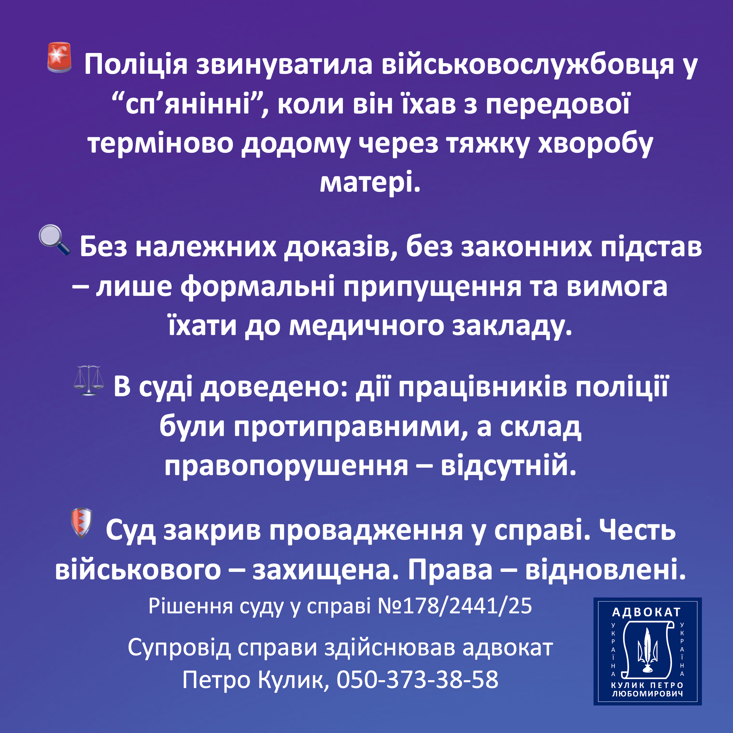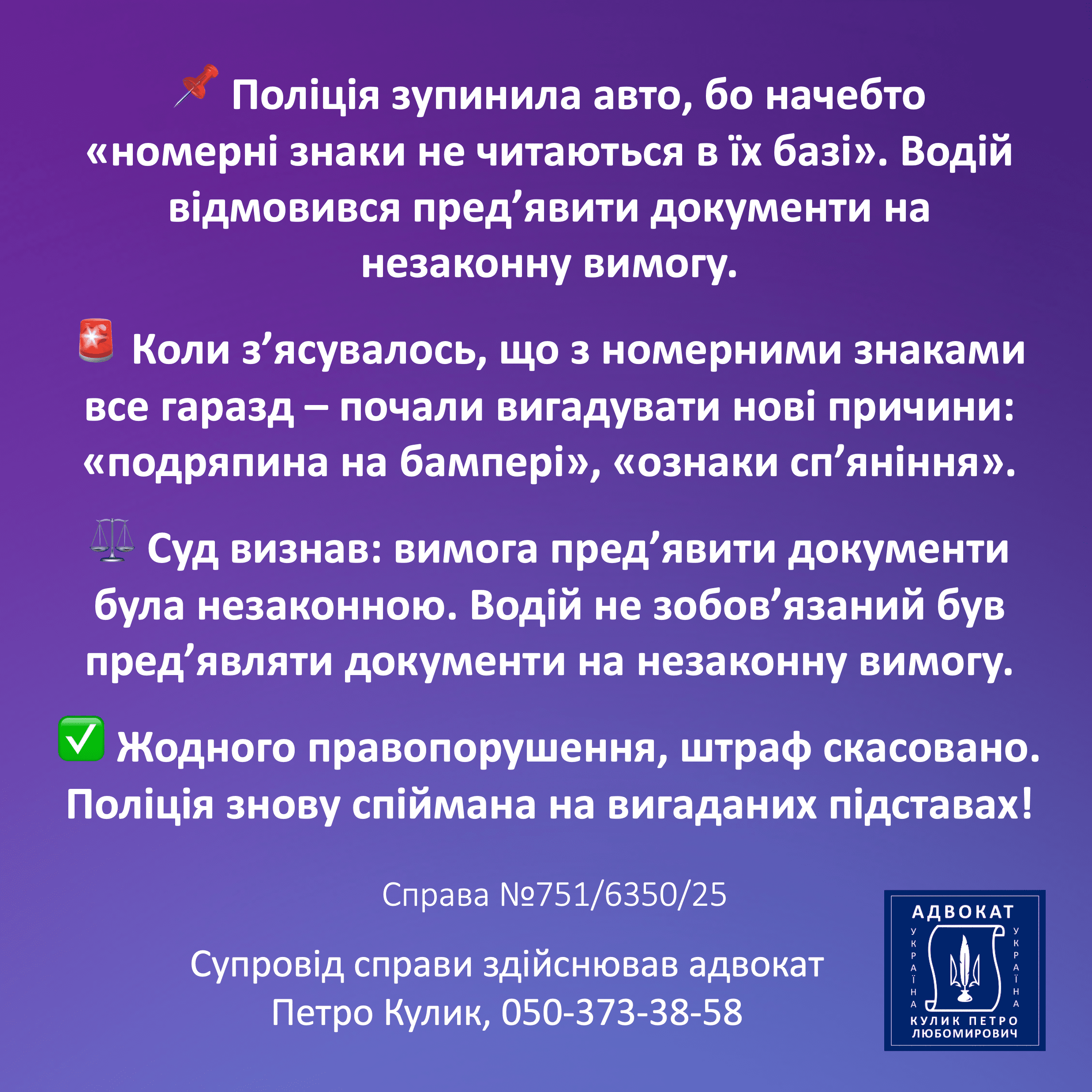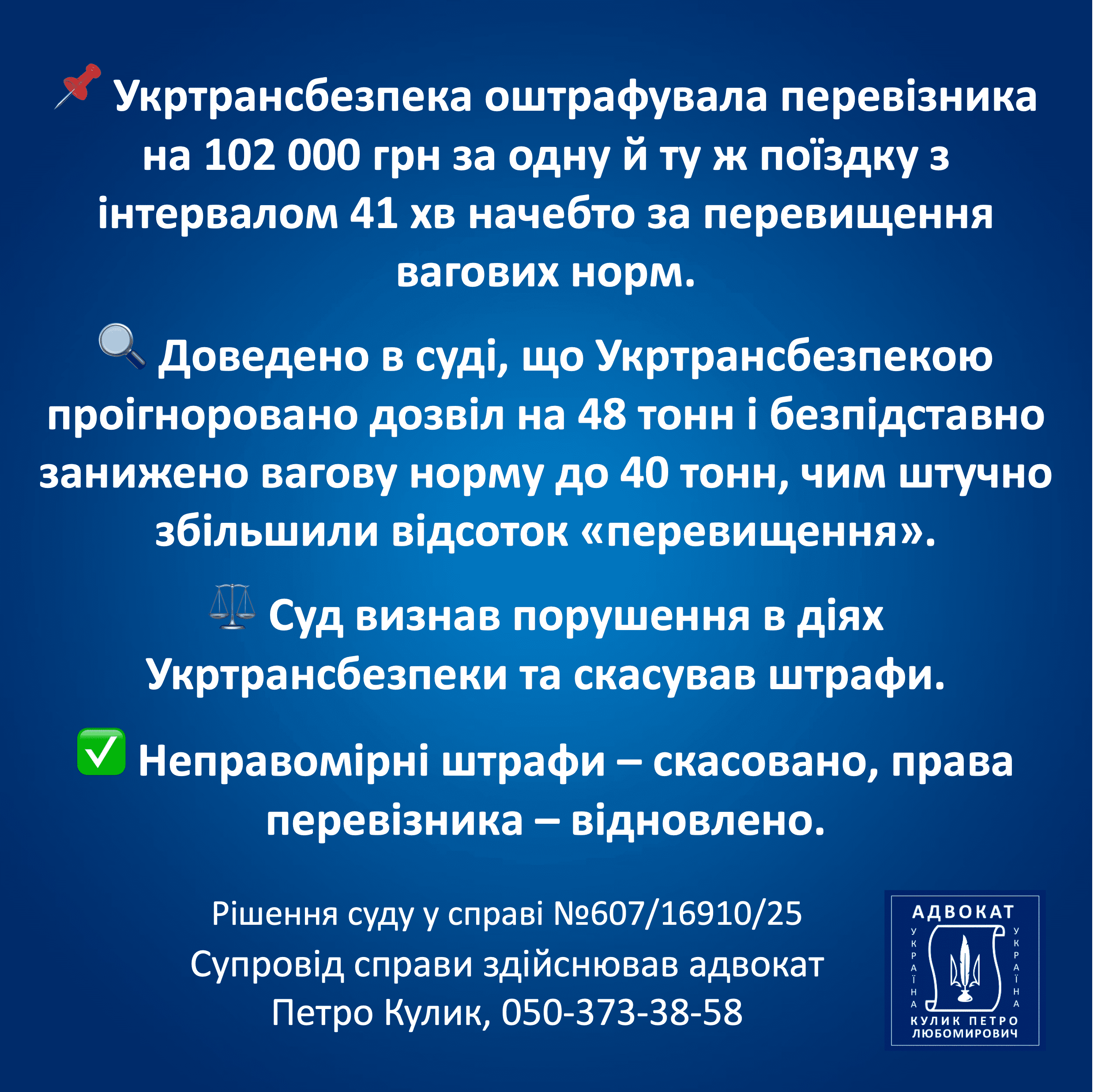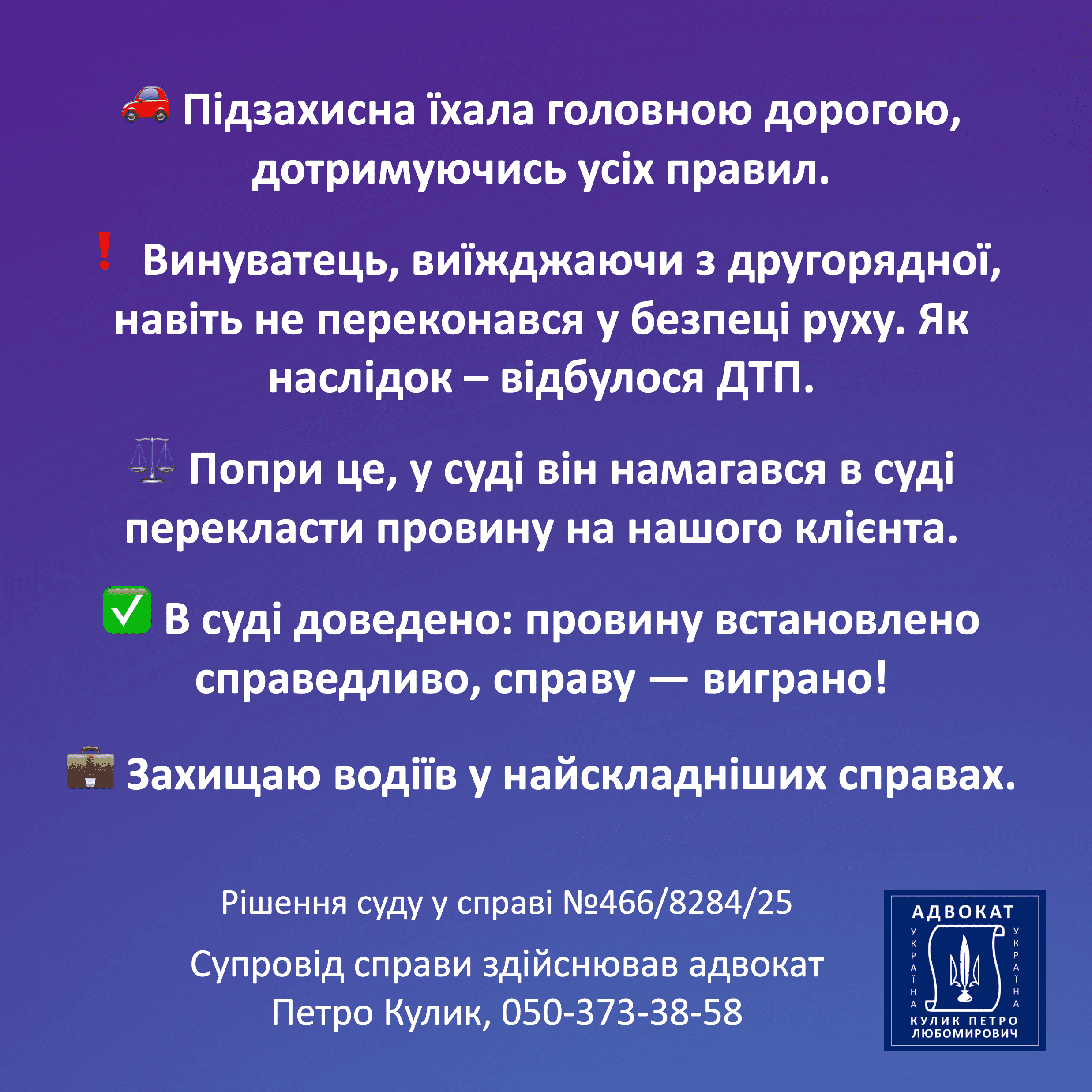 Виграні судові справи адвоката Петра Кулика є найбільш переконливим відображенням професійної роботи адвоката. Я публікую рішення, у яких суд підтвердив правильність моєї правової позиції та визнав обґрунтованість поданих аргументів. Результати у справах показують, що якісна юридична підготовка здатна повністю змінити хід процесу. Кожне рішення — це підсумок детального аналізу доказів, роботи з нормами закону та стратегічного підходу. Саме виграні справи демонструють ефективність моєї практики та підтверджують відповідальність перед клієнтом.